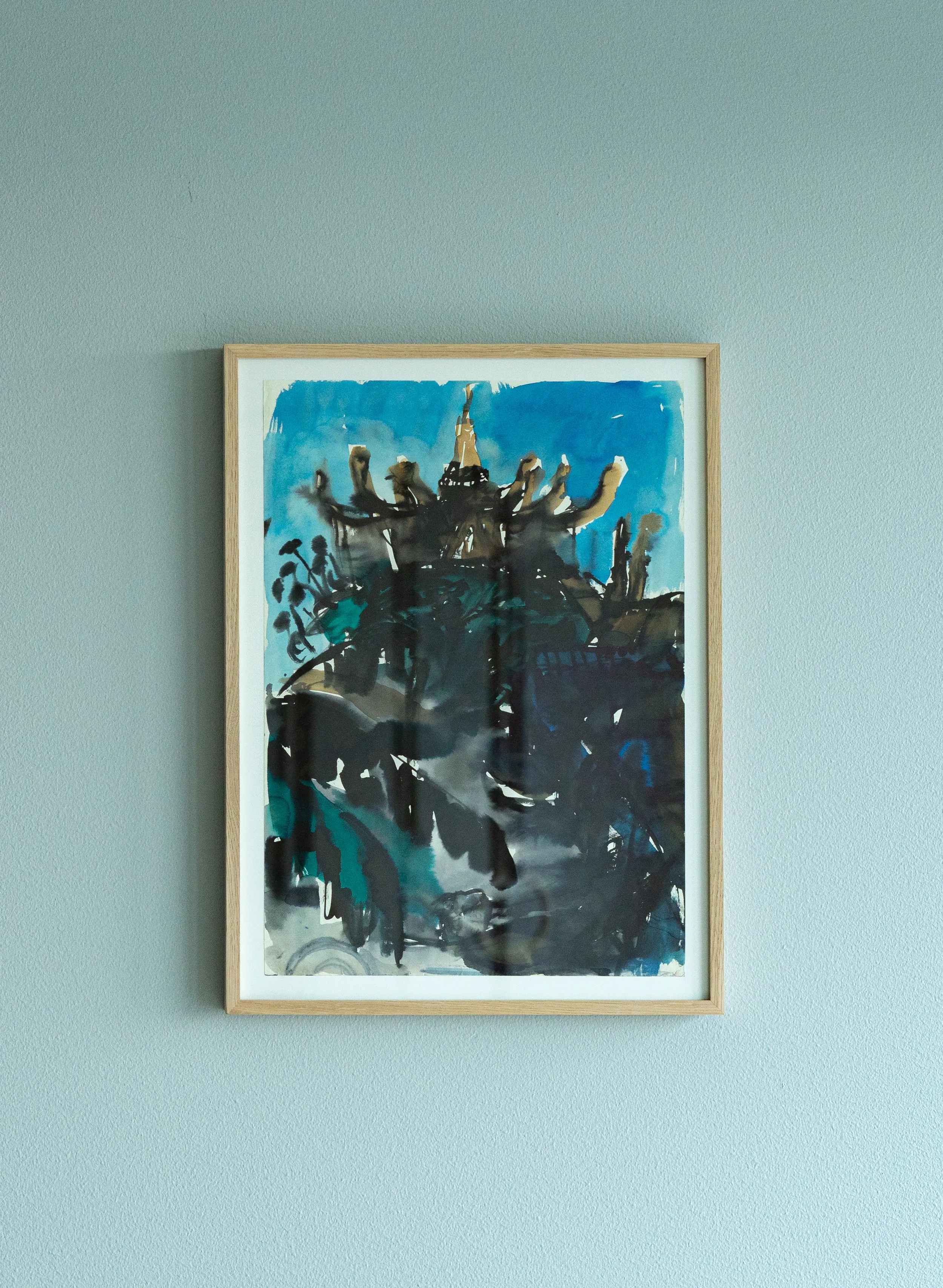 Pagoda in the floating village, ink on paper, 29 cm x 42 cm, 2022, framed, photo: blackthistleart
